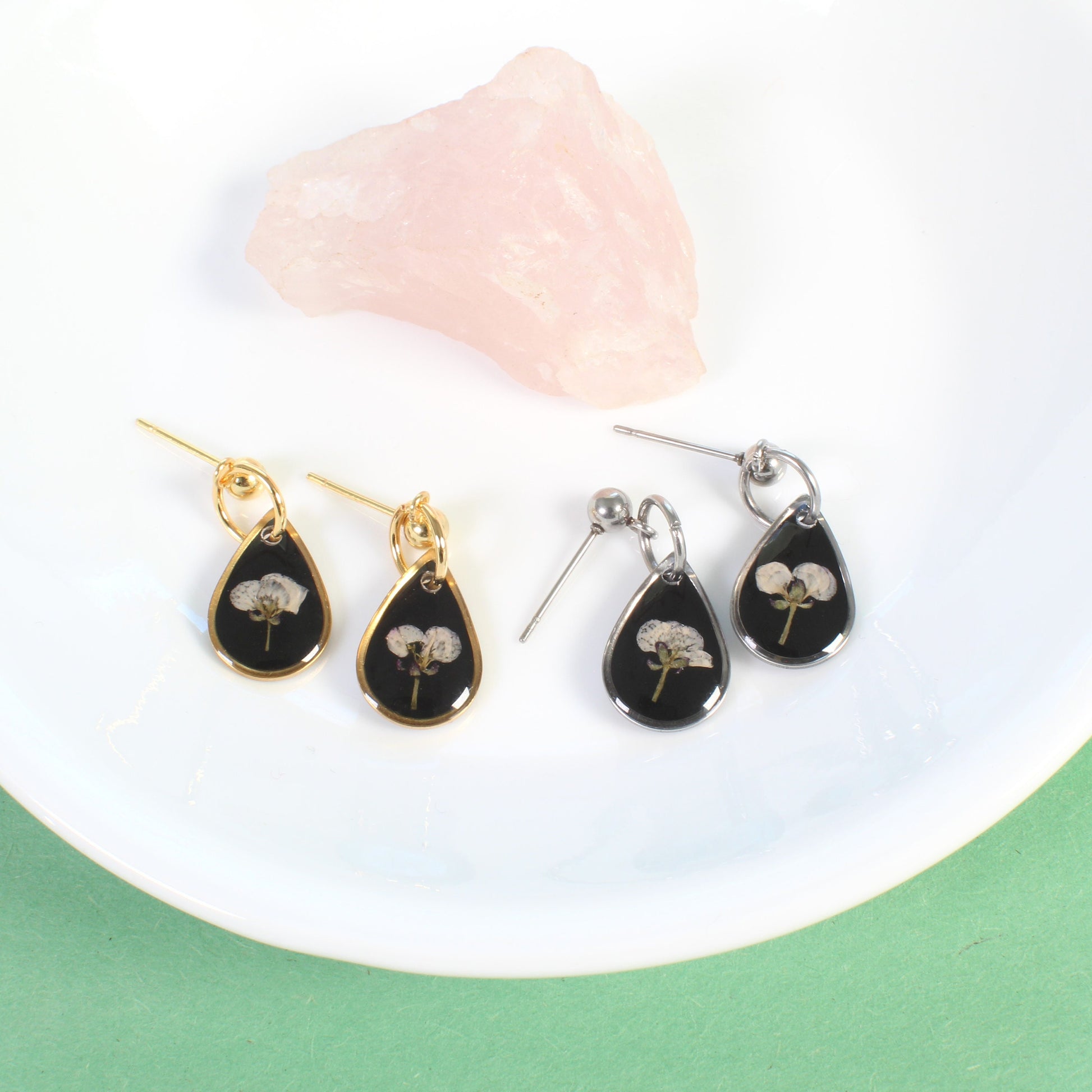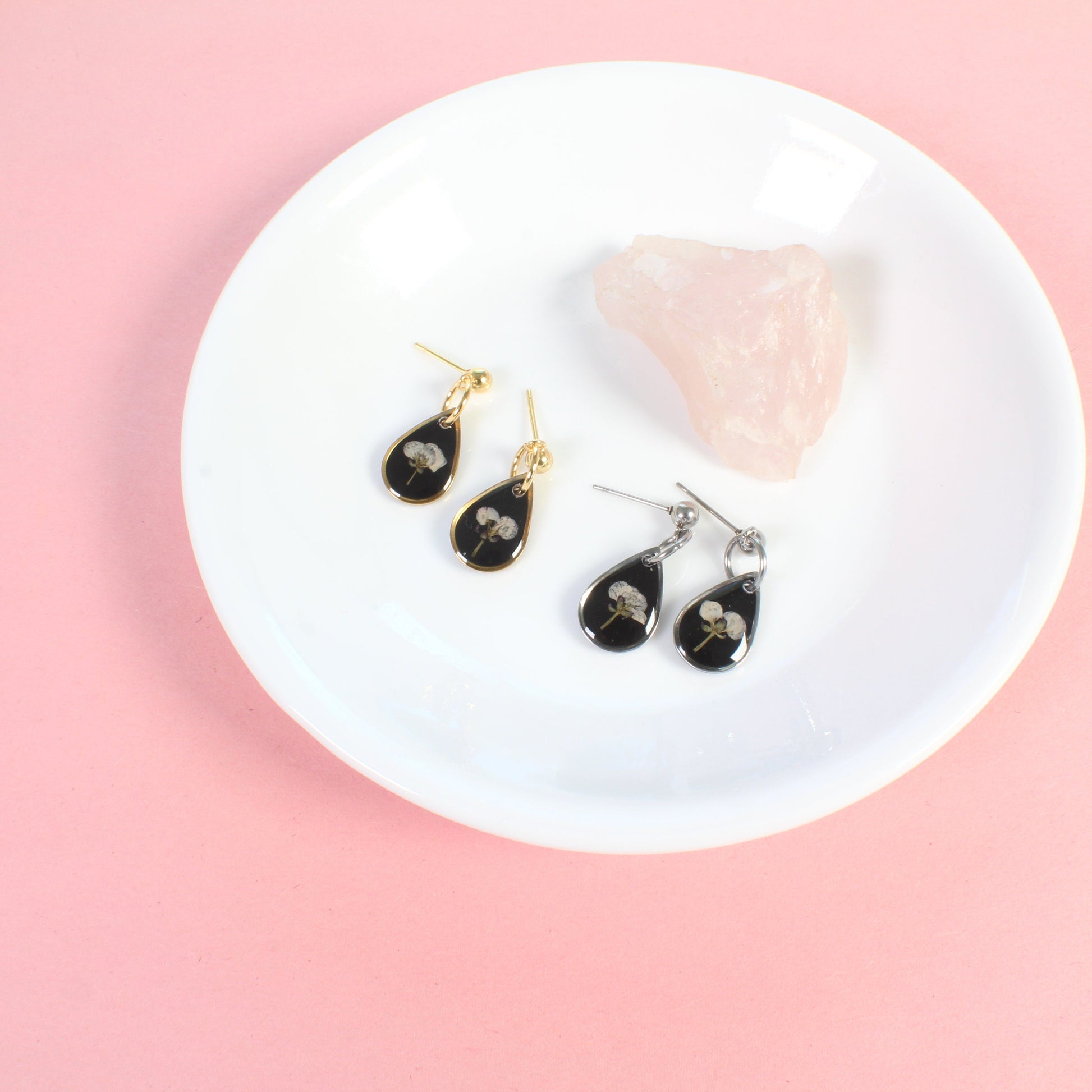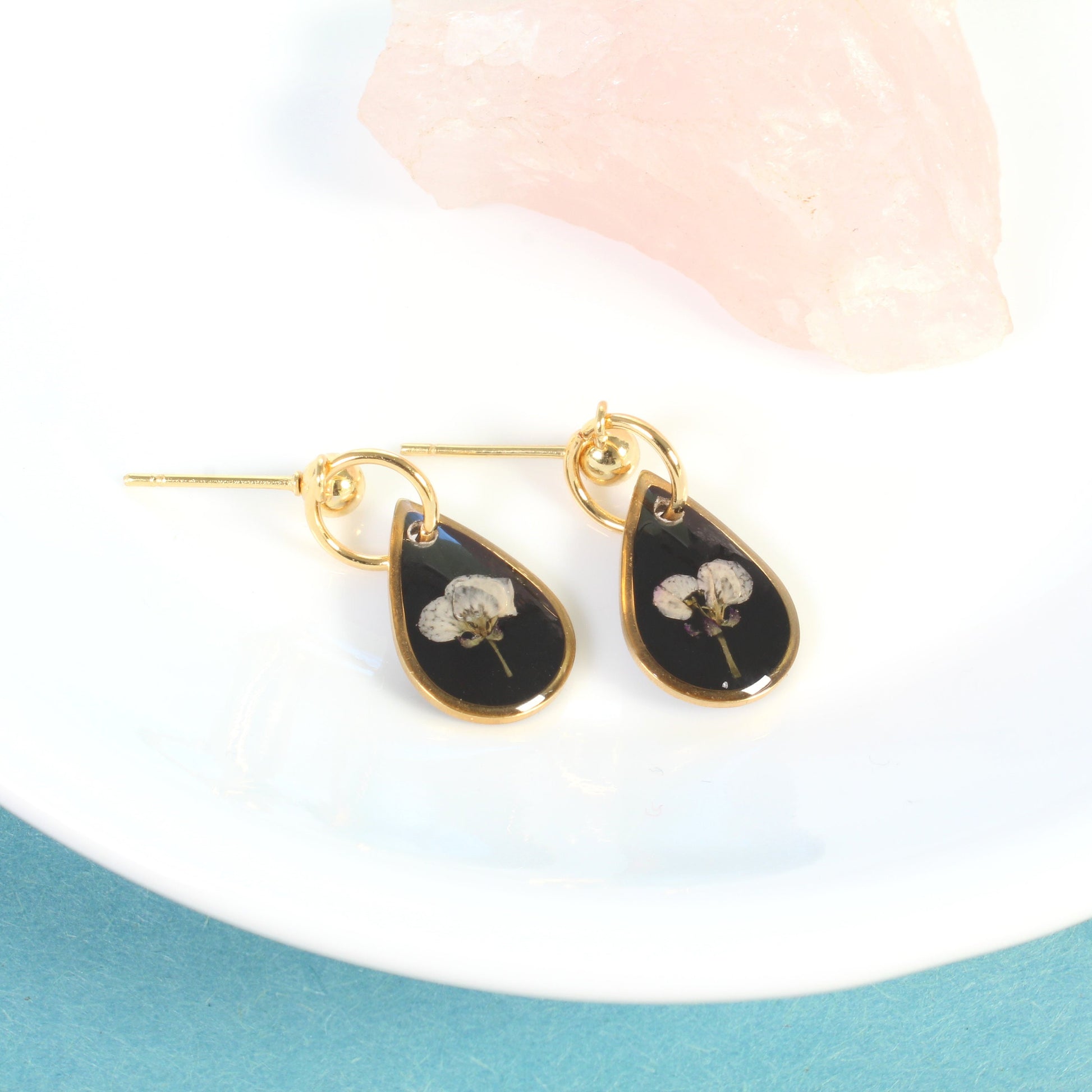Dainty gold pressed flower dangle earrings, black, white, natural flower jewelry, handmade, resin botanical earrings, small teardrop stud