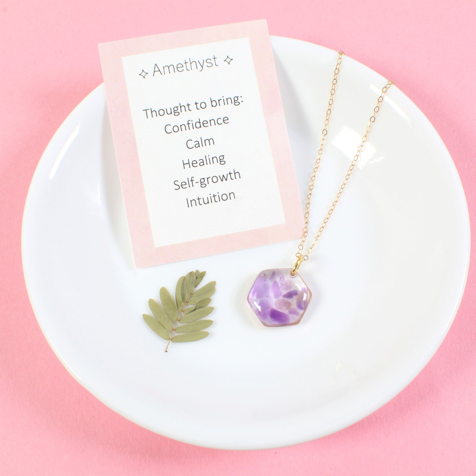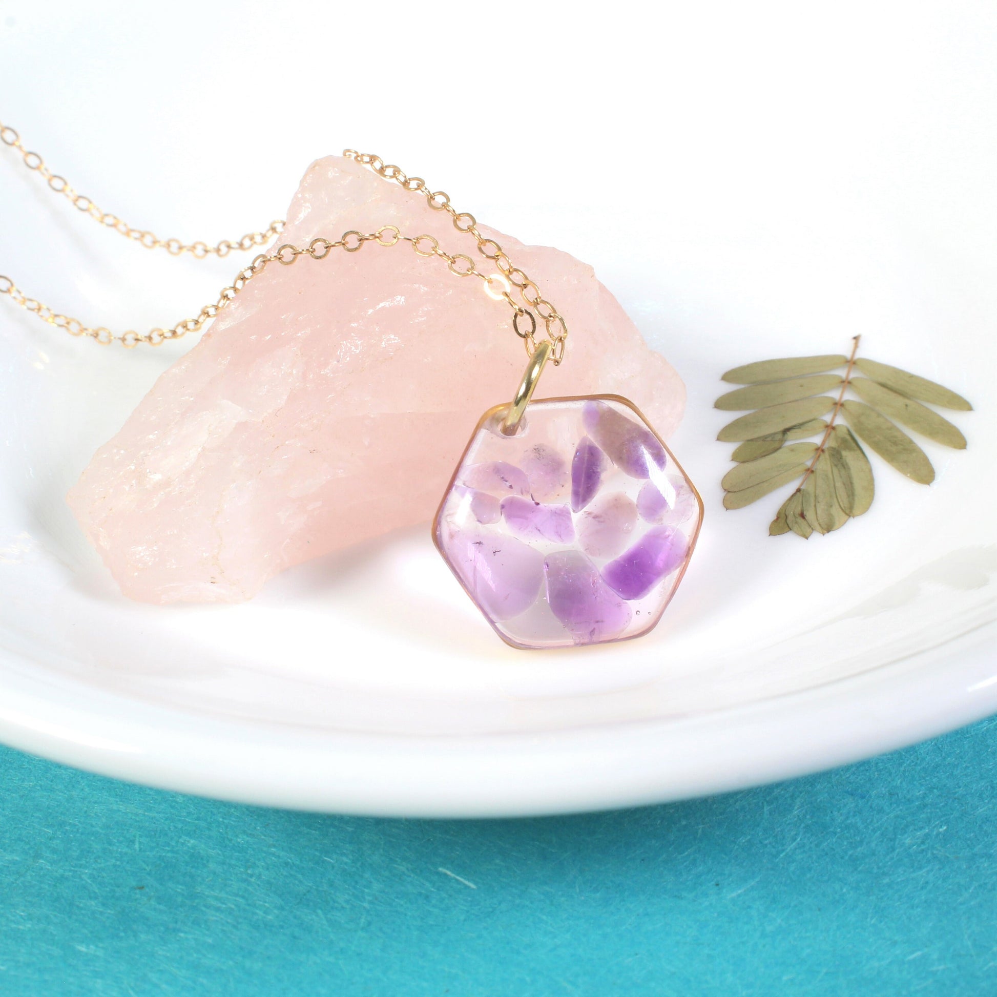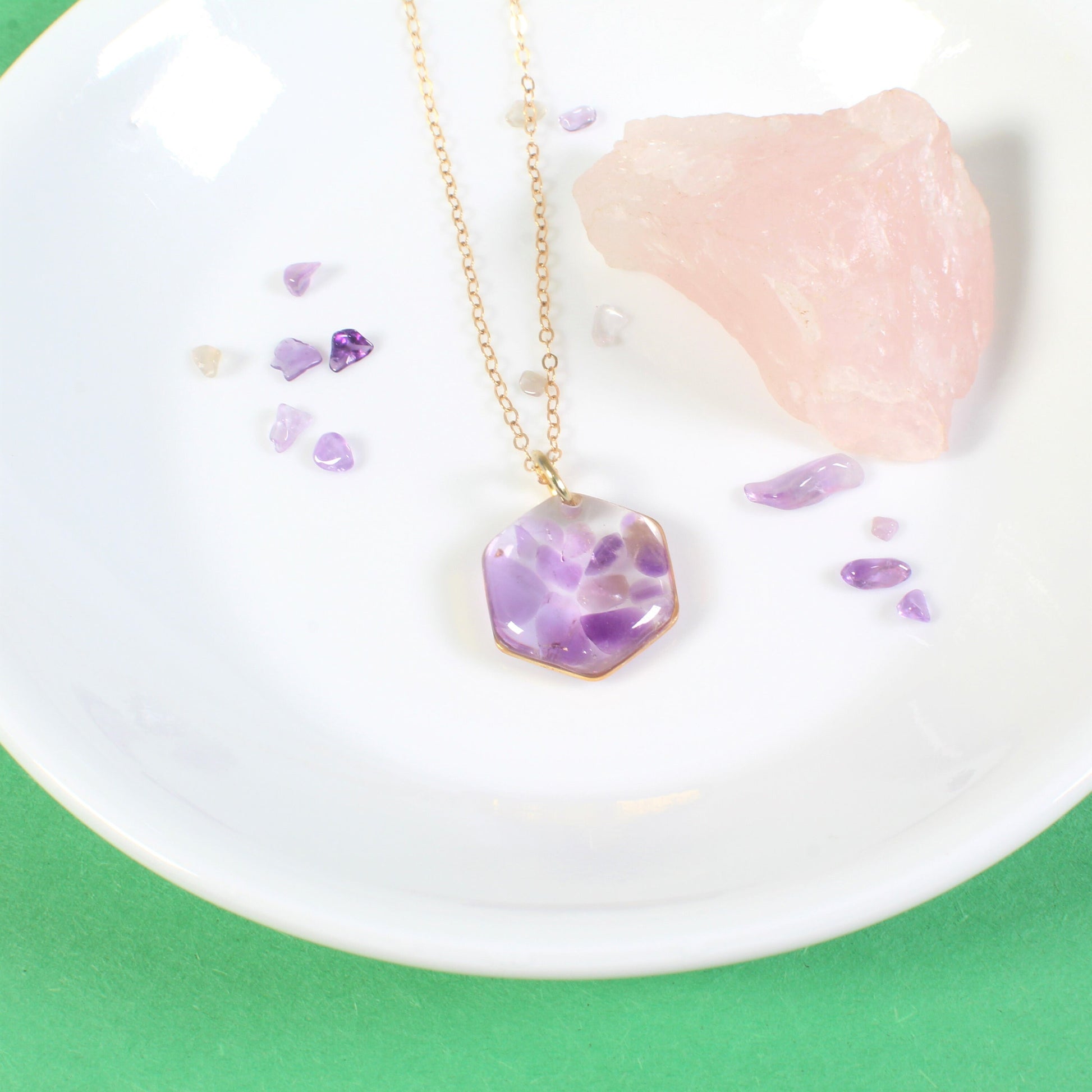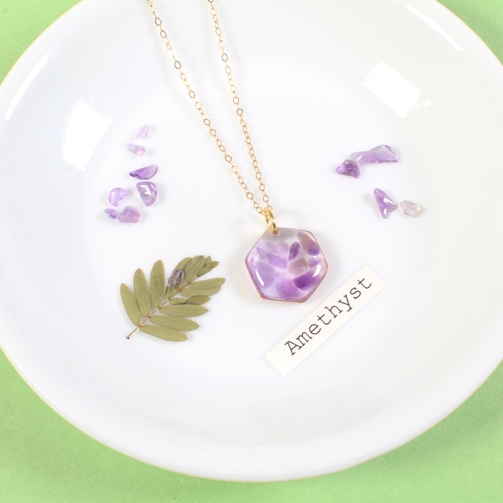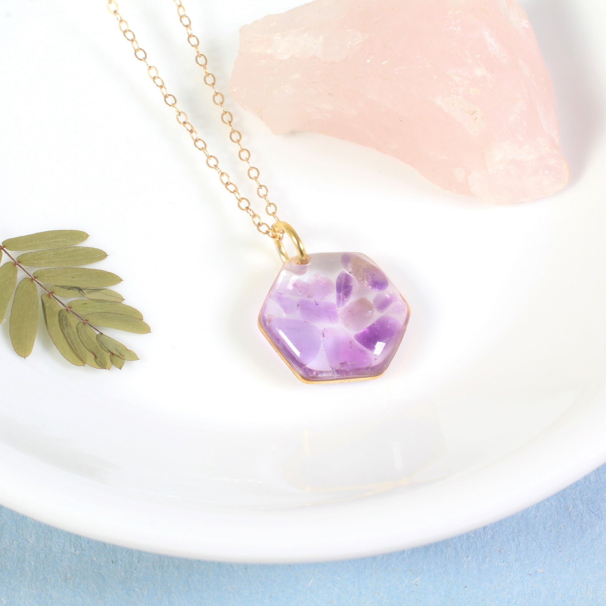 These handmade crushed gemstone necklaces feature real amethyst crystals in resin in a playful hexagon frame; amethyst is the birthstone for those born in February. A unique and dainty necklace available in gold, rose gold, or silver/steel.