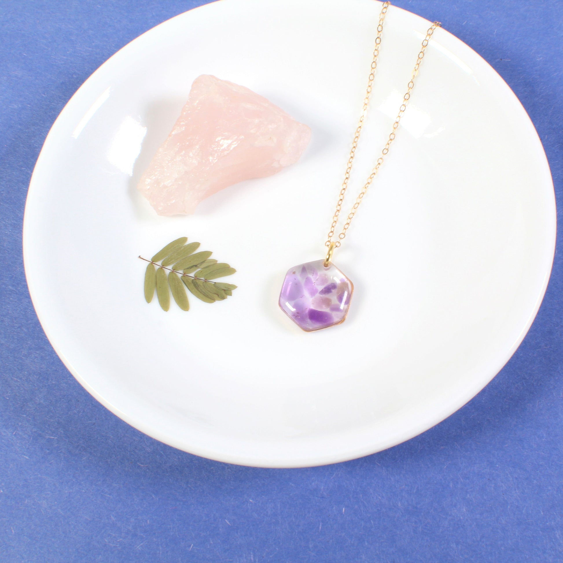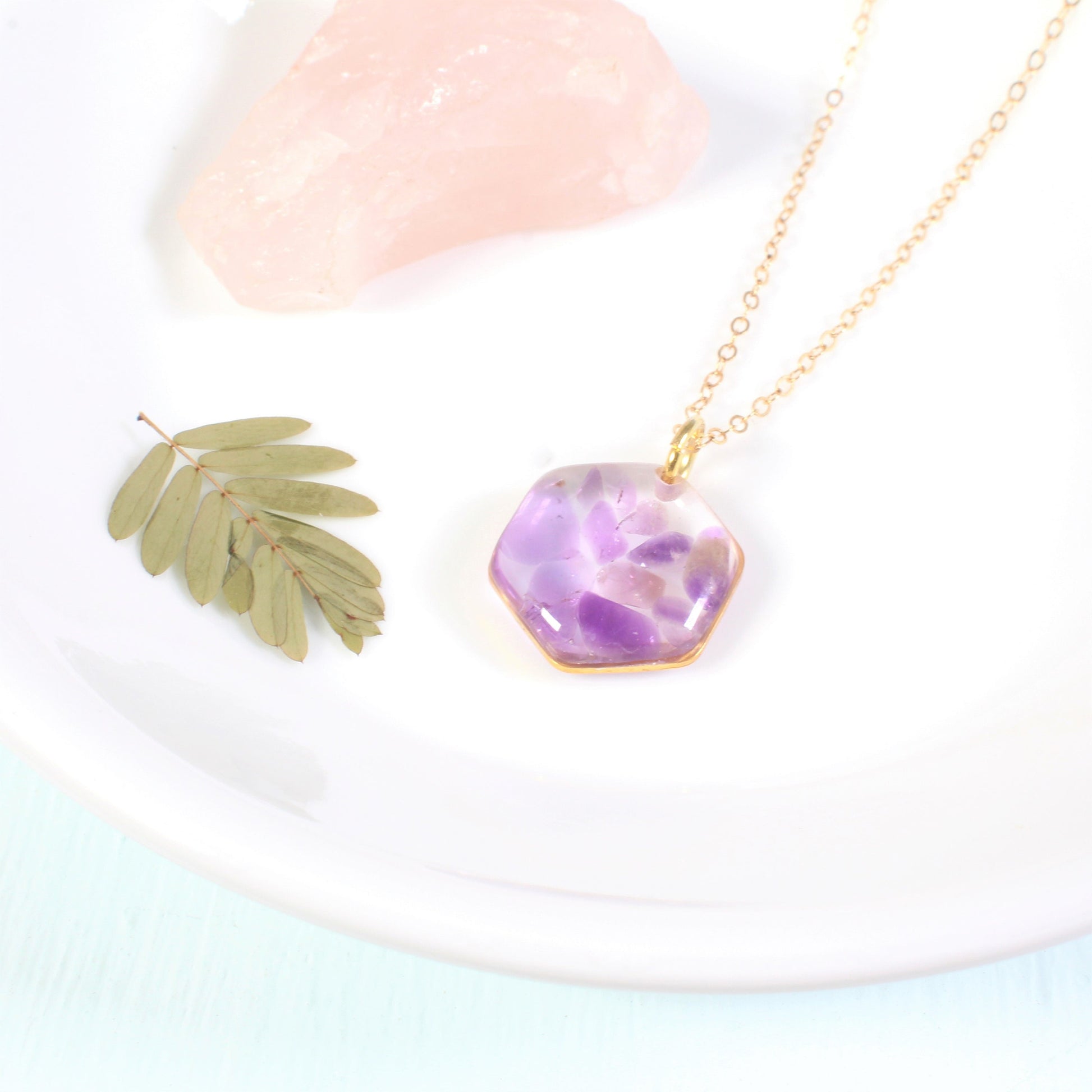 Crushed Amethyst Gemstone Resin Hexagon Necklace